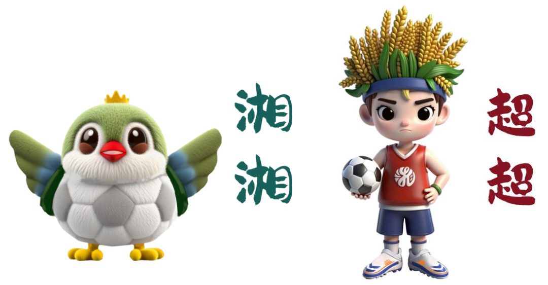 湘超联赛吉祥物“湘湘”,以常见的湖南省鸟红嘴相思鸟为设计原型,寓意湖南足球群众基础雄厚,张开的翅膀也寓意湖南足球的腾飞。吉祥物“超超”则是将超级水稻和阳光、青春的青少年足球运动员形象巧妙结合。